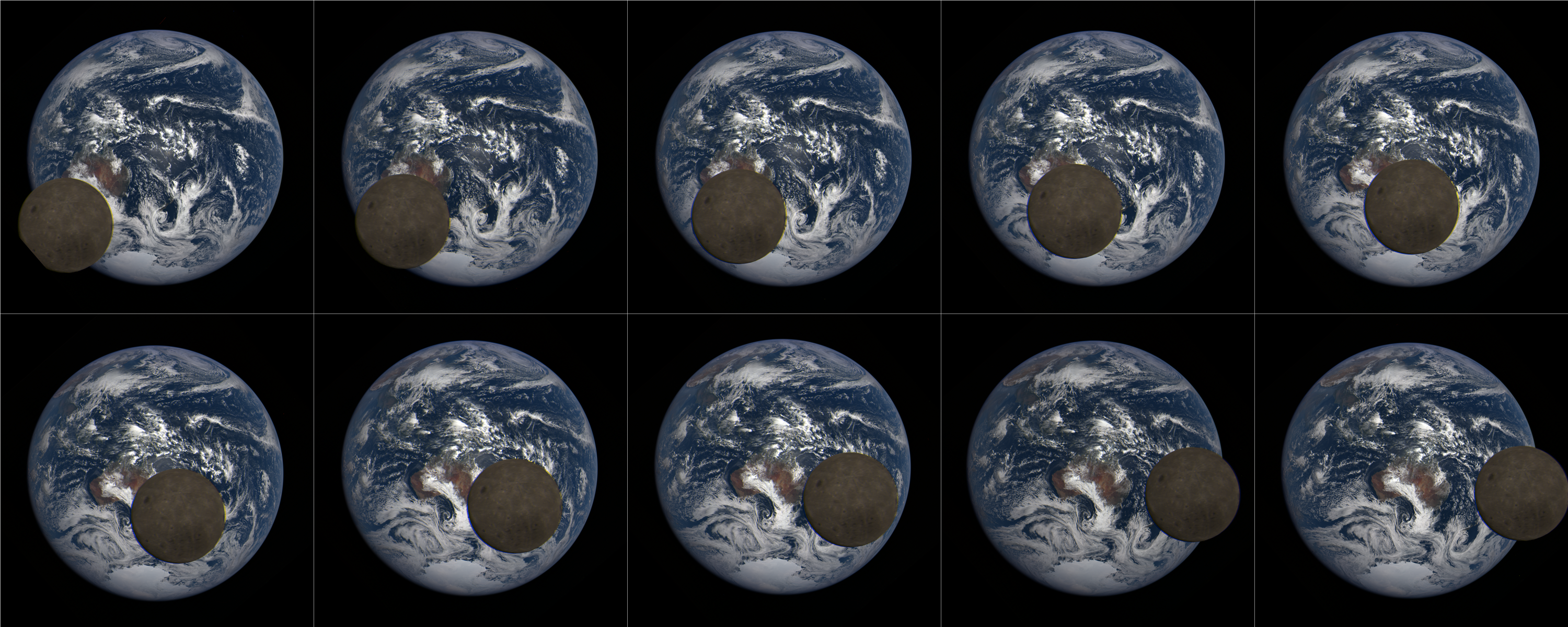 Hold tight as we’re going to see our beloved planet from some distance. You can start straight away by watching a past solar eclipse (hit the Try It Out button, and change the date for different eclipses). Since the telescope stays at a Lagrange point (L1), it can see the sun-lit part of the Earth 24/7. Therefore, in the case of a solar eclipse, it captures the shadow of the moon passing through different parts of our planet. The following picture depicts this scenario and became my motivation for doing this exercise.